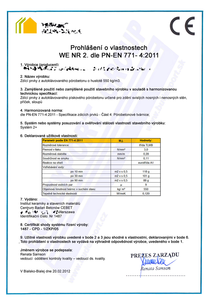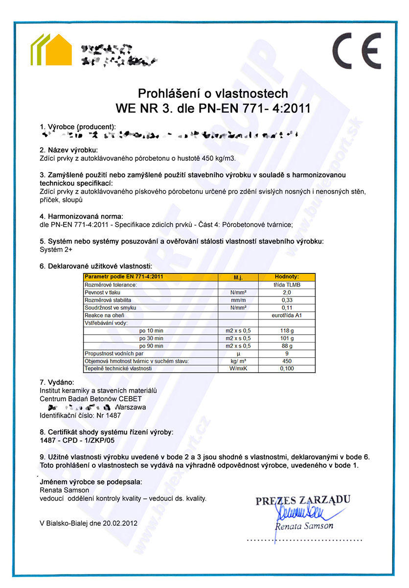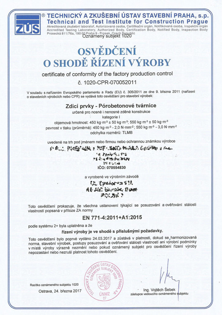 Osvědčení o shodě řízení výroby – zdicí prvky – Pórobetonové tvárnice »