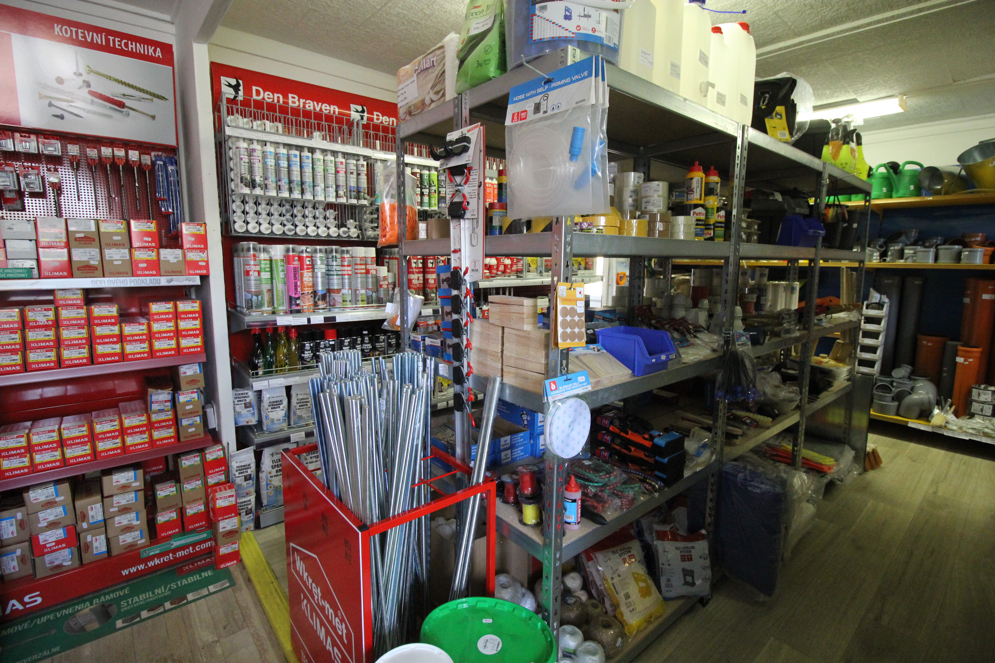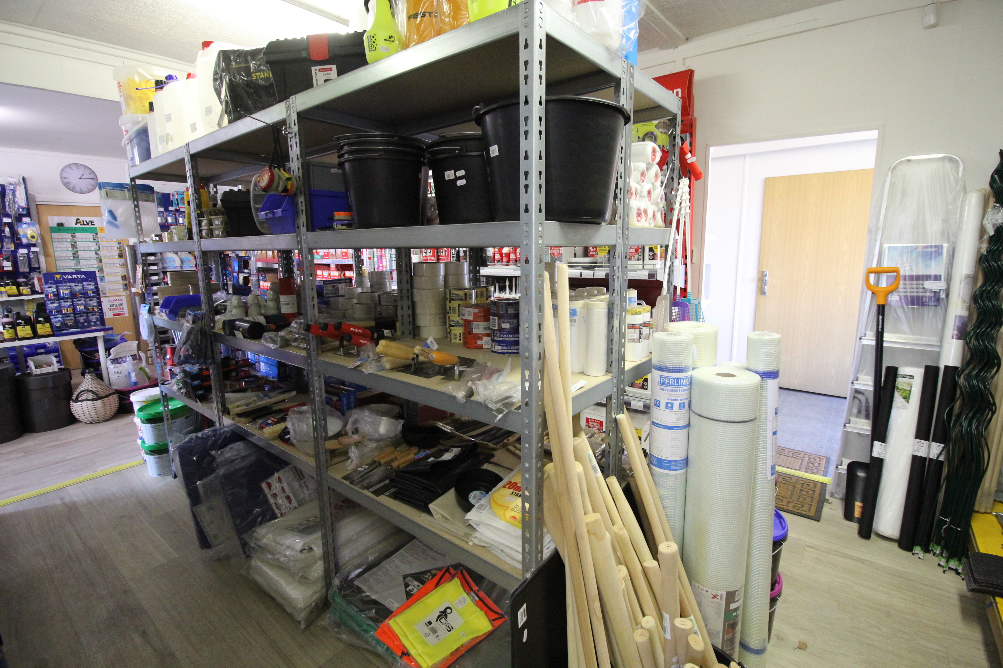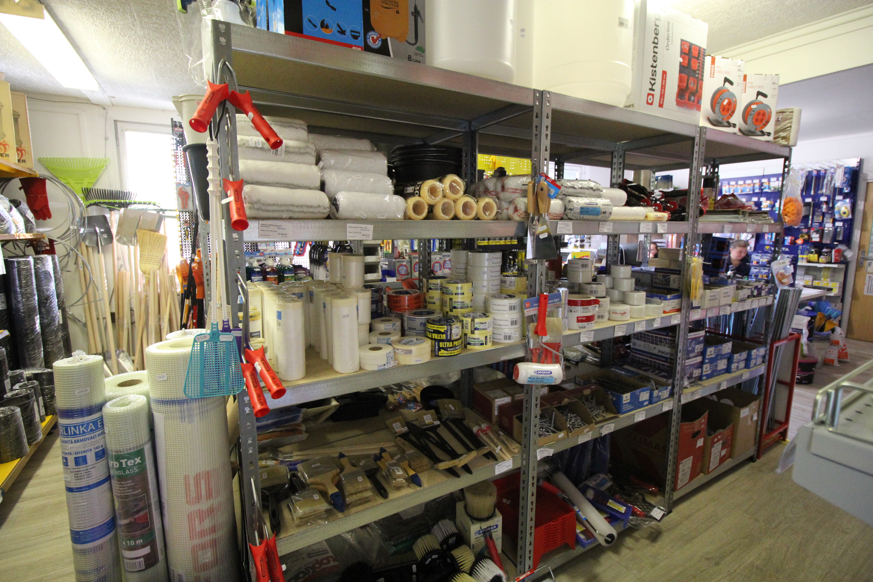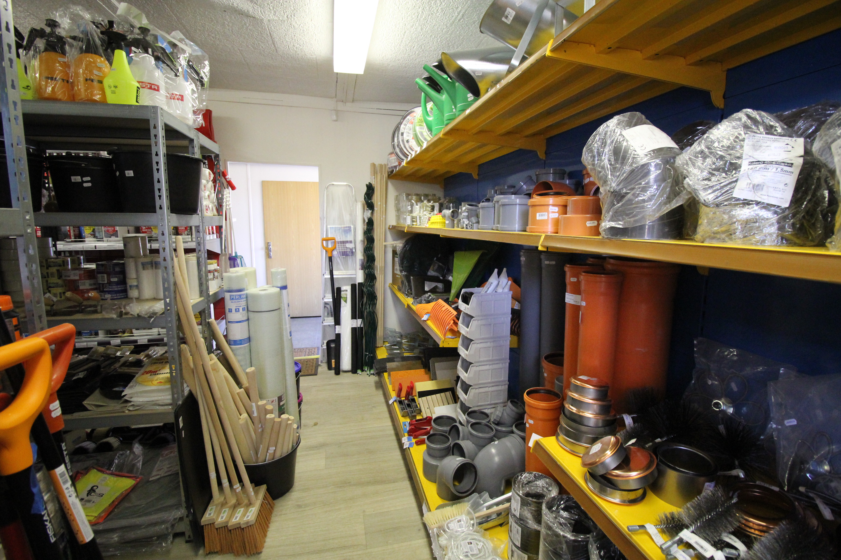 Obsahuje široký sortiment nářadí a doplňků pro opravy a stavbu.