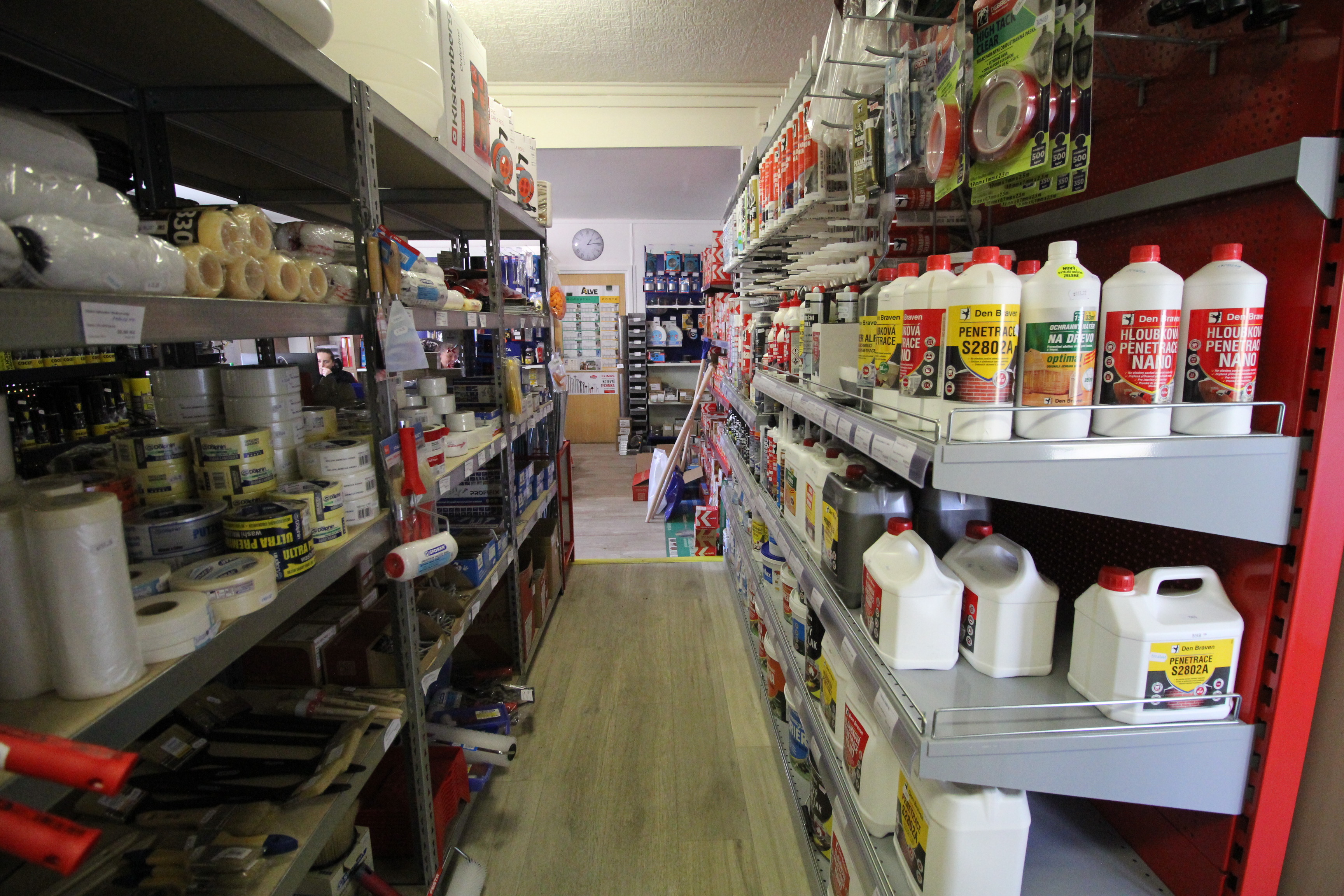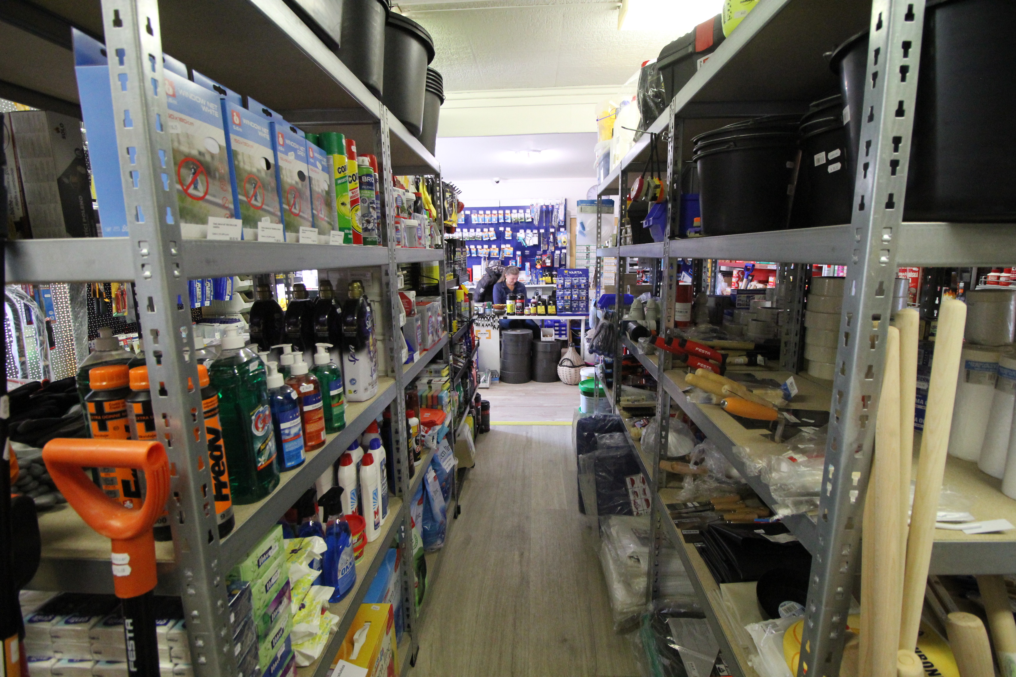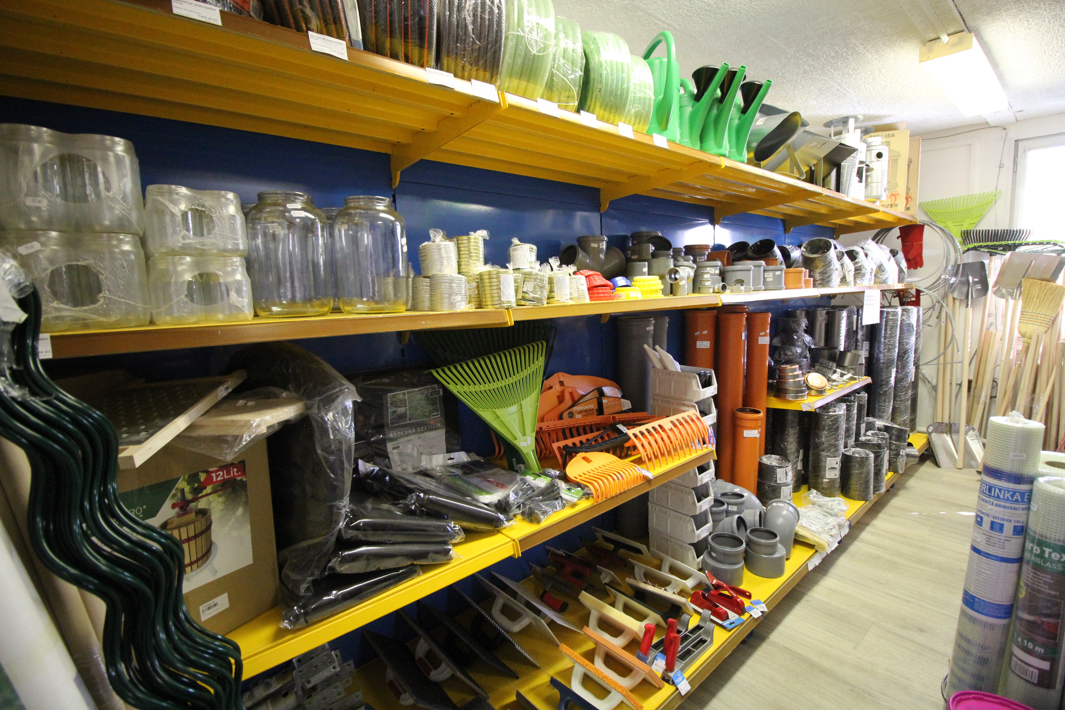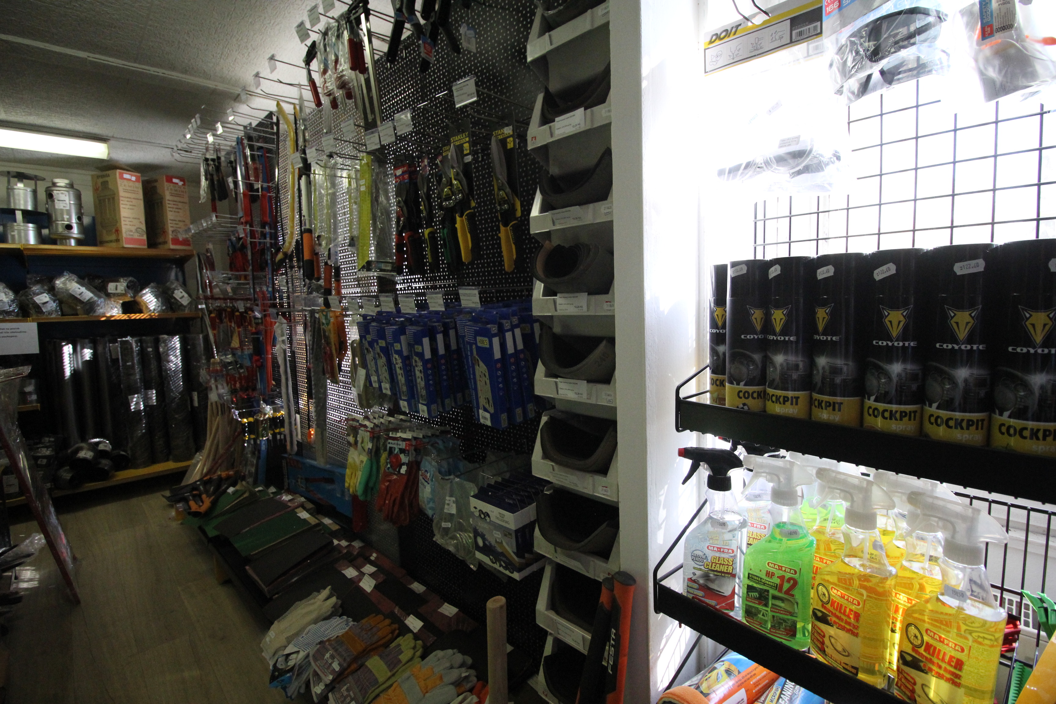 Obsahuje široký sortiment nářadí a doplňků pro opravy a stavbu.